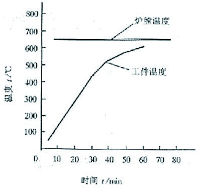 由于該工件厚度較厚,體積較大,采用硬加熱規(guī)范,把爐膛溫度預(yù)置到650℃,然后把安置好釬料和釬劑的工件放入爐膛進(jìn)行加熱,待工件溫度上升到600℃即可出爐冷卻。圖3為爐膛和工件溫度與時(shí)間的變化曲線。2.3 焊后清洗 釬焊后的工件在20%左右的硝酸溶液中清洗,可以得到滿意的清洗效果。
