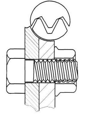在施必牢螺母內(nèi)螺紋的牙底處有一個30度的楔形斜面,當螺栓螺母相互擰緊時,螺栓的牙尖就緊緊地頂在施必牢螺紋的楔形斜面上,從而產(chǎn)生了很大的鎖緊力。由于牙形的角度改變,使施加在螺紋間接觸所產(chǎn)生的方向力與螺栓軸線成60度角,而不是像普通螺紋那樣的30度角。這就使得施必牢螺紋方向壓力遠遠大于扣緊壓力,因此,所產(chǎn)生的防松摩擦力也就必然大大增加了。